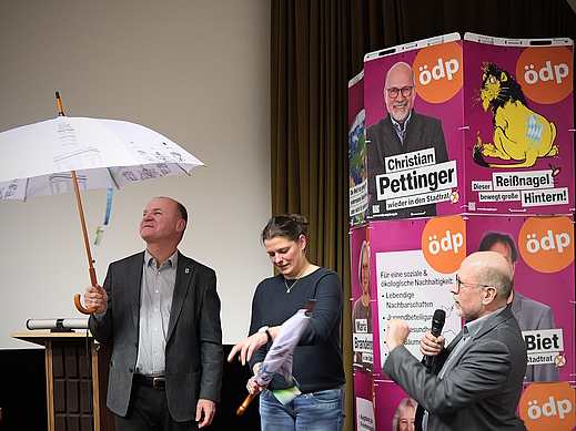 Nach einer regen Fragerunde, bei der sich die Referierenden z.T. auch weit über das zentrale Thema hinaus als äußerst sattelfest zeigten, bedankte sich ÖDP-Stadtrat Christian Pettinger im Namen der Anwesenden und des ÖDP-Kreisverbandes herzlich bei den beiden und überreichte Ihnen als Dankeschön je einen Regenschirm mit dem Perlach-Turm-Motiv darauf. Ein Preisanteil des Schirms fließt ja in die Sanierung des Augsburger Wahrzeichens.